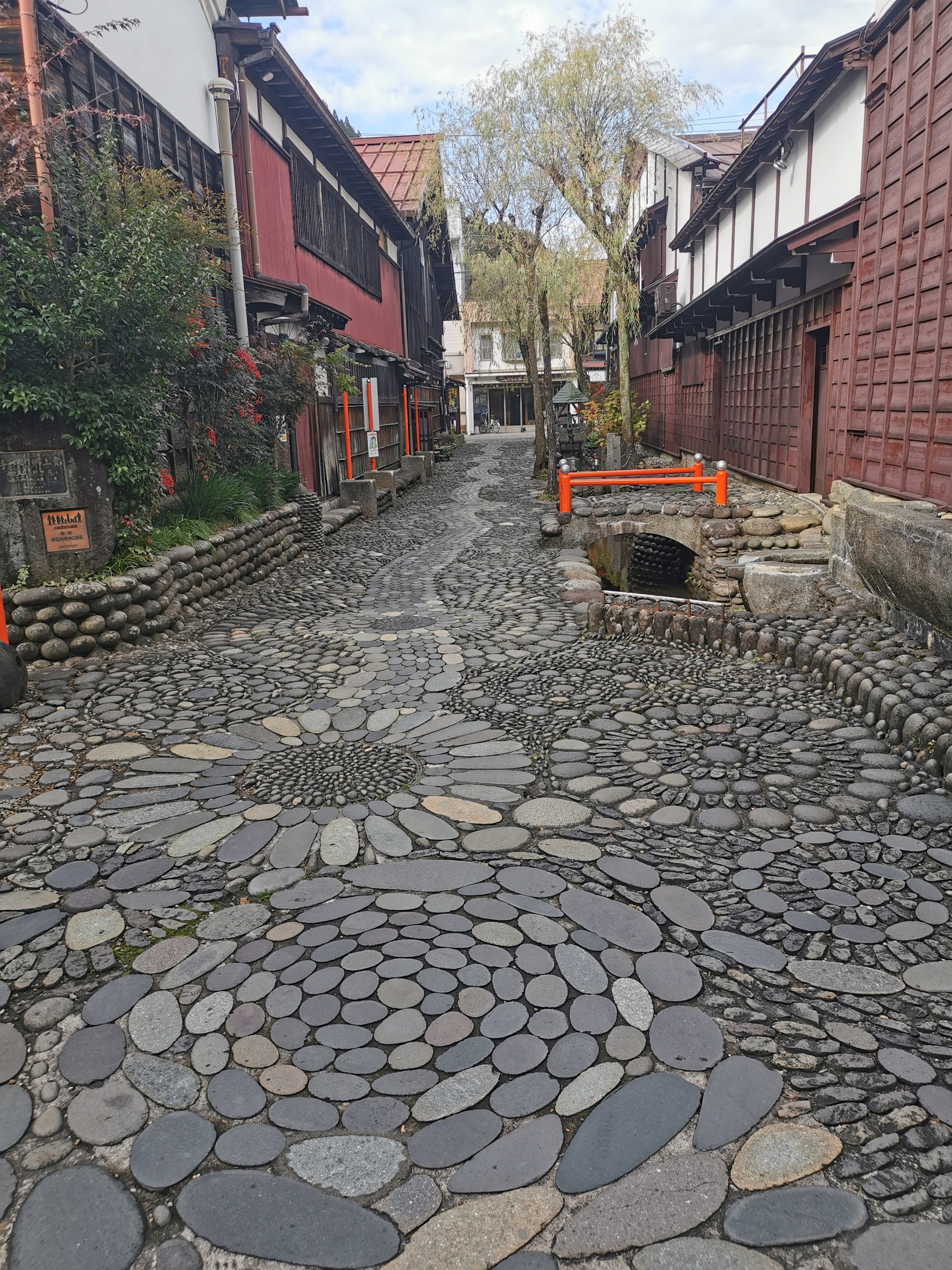 After I stopped trying to touch the fish and catch one in my hands I noticed something on top of one of the hills in the distance. It was a white Japanese castle overlooking the village! I had no idea this village would have such a beautiful castle overlooking it. I felt like this village was made to be in a Disney fairytale. Even the pavement in the village centre had been paved in a beautiful design. It looked almost like cobblestone.