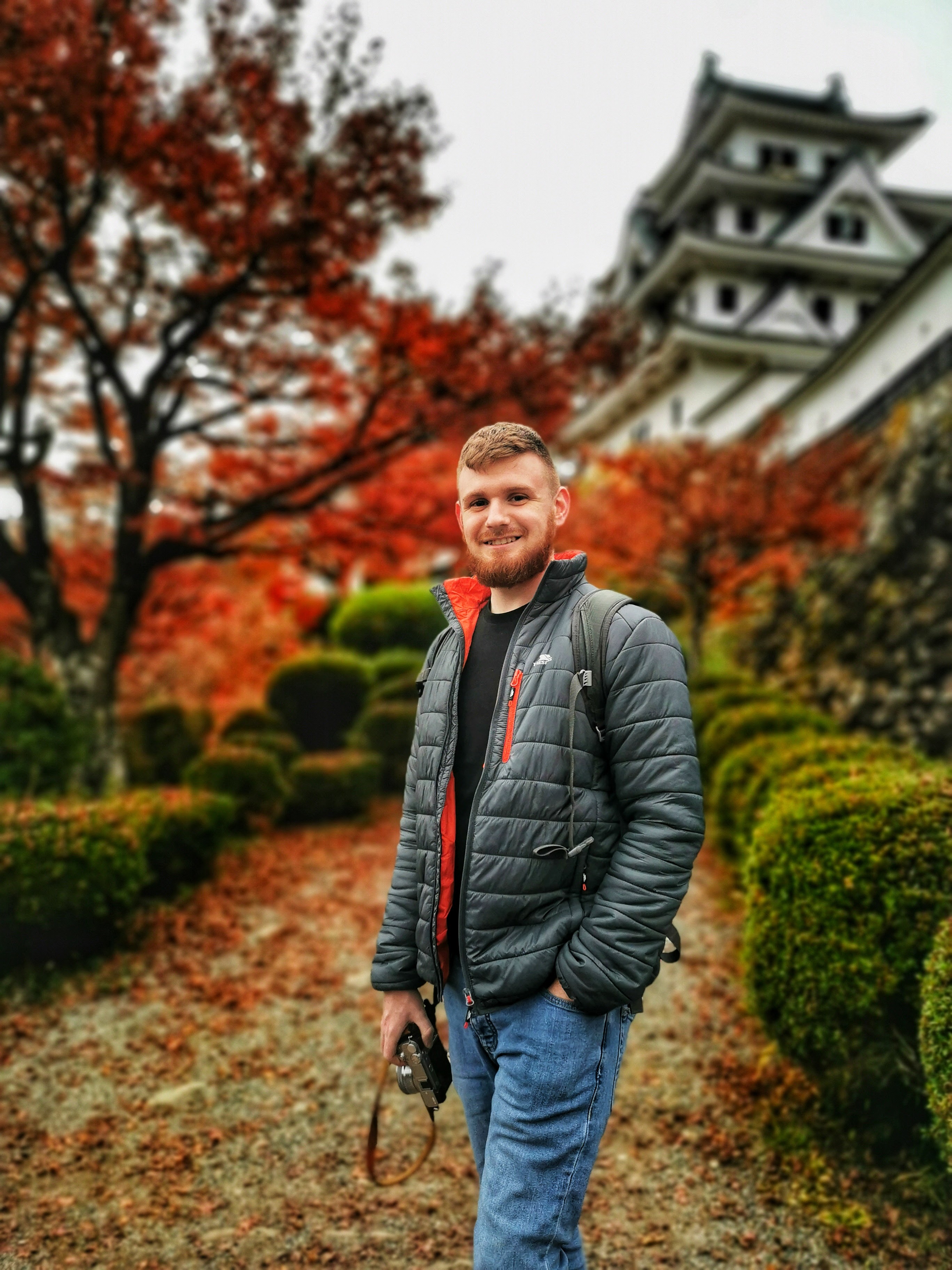 When I finally reached the top I found myself questioning why I always end up hiking, no matter what trip I take. But as I looked out at the view I immediately knew why. t. When the trees cleared and the hill didn’t seem as steep, I could see red cherry blossom trees around me; they were not pink at this time of year, as well as some of the best-timed bushes and bonsai trees. These all headed up to the castle’s entrance. When I got to the entrance I realised that I was able to just walk right in, no ticket or anything, I just saw an old Japanese man smoking a pipe who seemed shocked to see me at first but then gave me a friendly wave indicating that I was welcome to go inside.